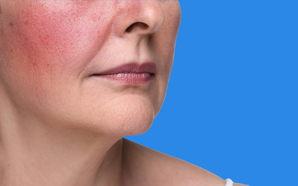 Rosacea is a chronic skin condition causing redness in the center of the face—usually the cheeks, nose, forehead, and chin.