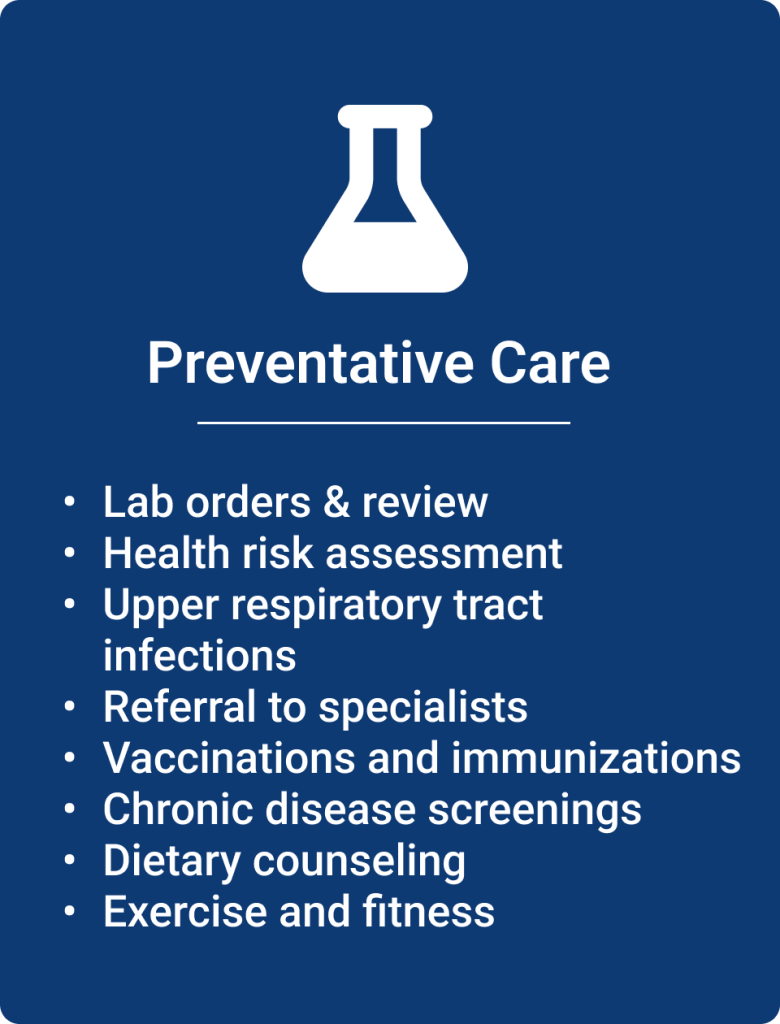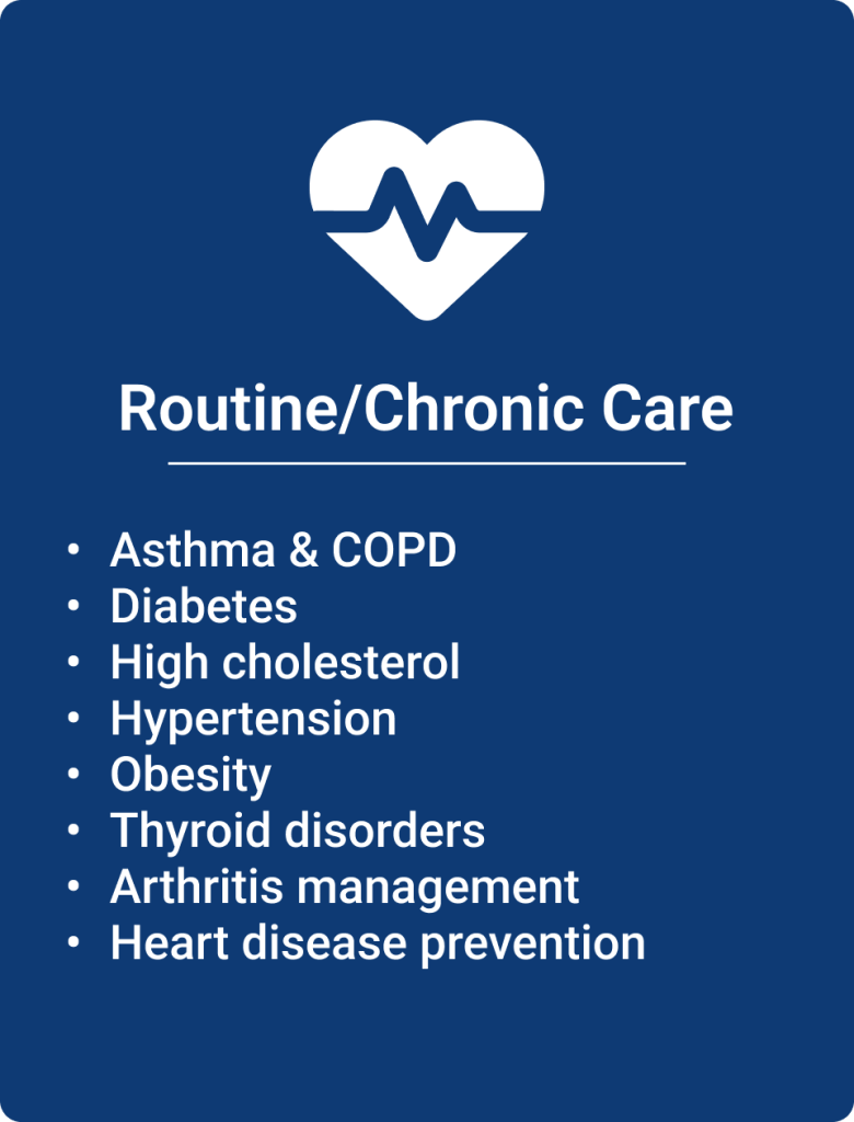 iVisitDoc’s Virtual Primary Care expands access to preventive, routine, and chronic care for your members. Our network of board-certified primary care physicians (PCPs) can conduct wellness screenings, manage chronic conditions, refer to high-value specialists, and provide follow-up care—all through our secure, HIPAA-compliant virtual platform.